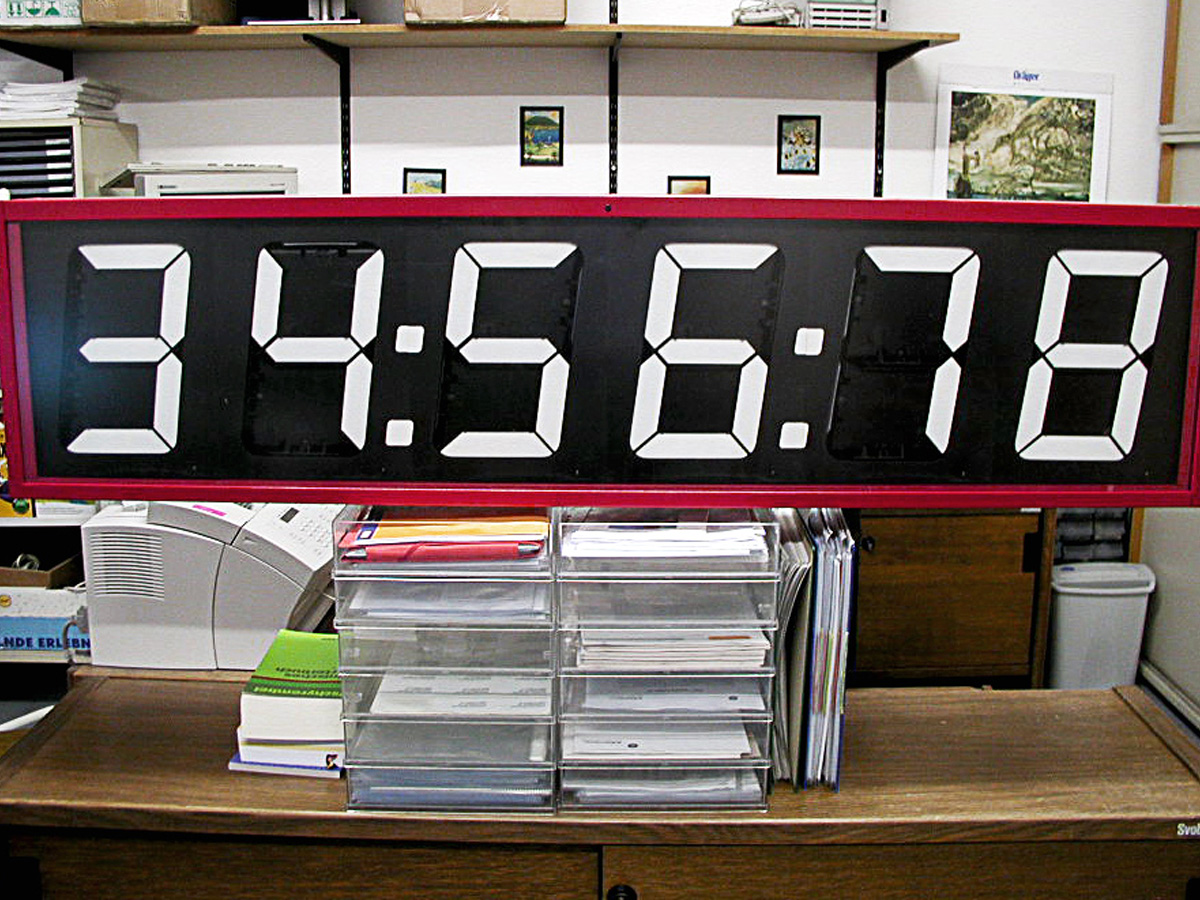- Eine Anzeige mit 28 cm hohen, elektromechanischen Klappziffern zeigt zeigt die von der Weite lesbare erzielte Laufzeit.